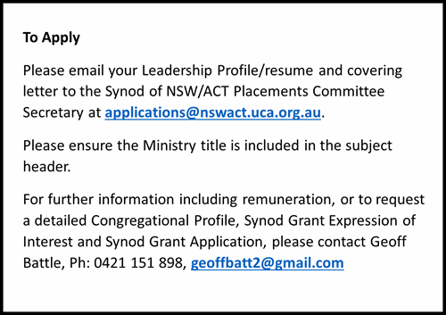 - Reporting to: Manning Uniting Church Council